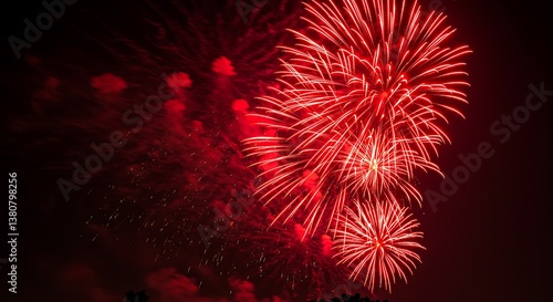 Red Fireworks Display at Night, Festive Celebration AI Generated
