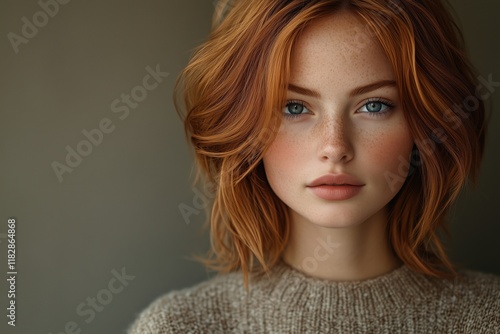 Red head woman with a bob haircut wearing a soft brown sweater against a solid background