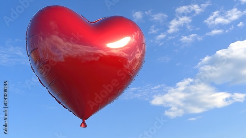 Red heart balloon floats, sunny sky, clouds, love
