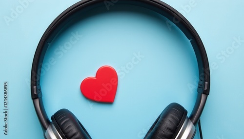 Red Heart Shaped Paper Cutout on Black and Silver Headphones Against a Light Blue Background