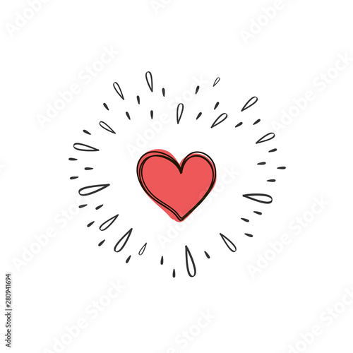 Red Heart with Sunburst. Vector Explosion. Hand drawn Design Element. doodle style.