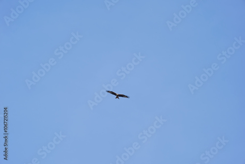 Red kite circling in the sky with blue sky background at Swiss City of Zürich on a sunny autumn afternoon. Photo taken November 6th 2024, Zurich, Switzerland.