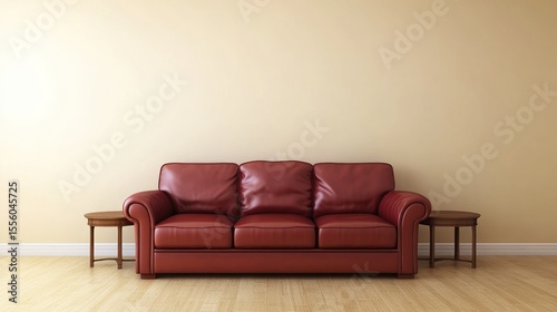 Red leather sofa and side tables in a beige room.