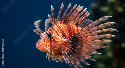 Red Lionfish Face Closeup - An underwater closeup of a red lionfish, symbolizing beauty, danger, ocean life, intricate patterns, and marine wildlife