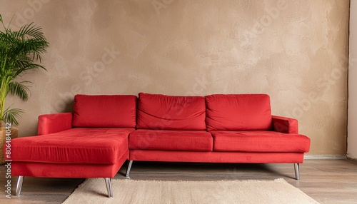 Red modular corner sofa against blank brown stucco wall with copy space. Loft interior design of modern living room, home.