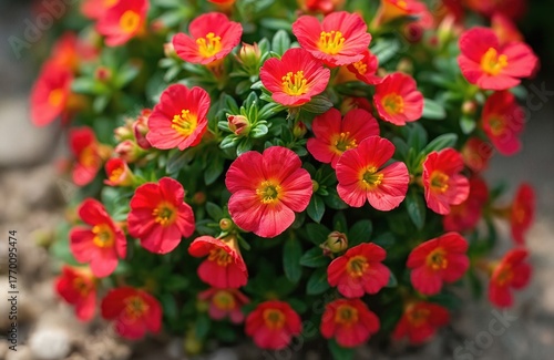 Red moss-rose purslane flowers bloom with bright yellow centers. Green succulent leaves surround colorful blossoms. Plant grows in sunny garden, showing summer beauty. Vivid petals open wide,