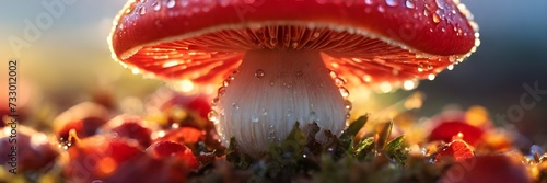 Red mushroom with a sunrise in the background, dew drops on the cap, sunlight and grass.