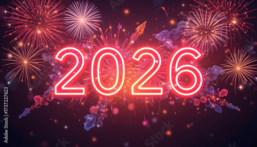 Red neon 2026 numbers with pink and orange fireworks display year celebration