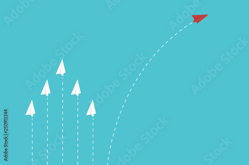 Red paper plane changing direction from white. new idea. different business concept. courage to risk. leadership. vector illustration