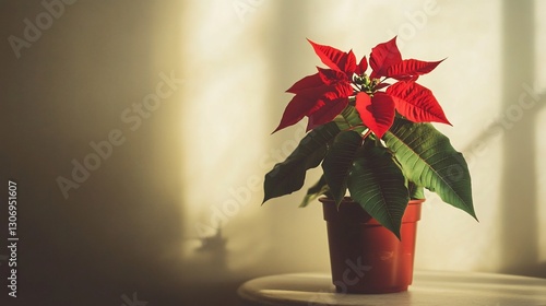 Red poinsettia in pot, on table, light shining through window, shadows on wall