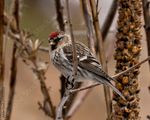 Red poll Photo and Image. Finch close-up profile view perched with a foliage background in its environment and habitat surrounding.