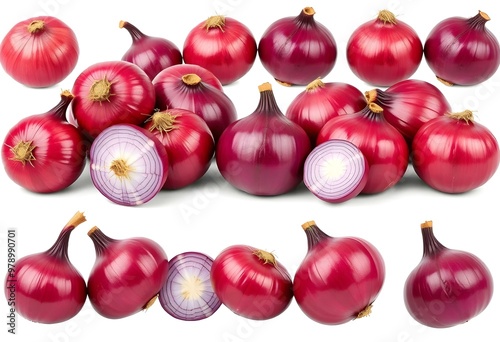Red purple onion onions vegetable, many angles and view side top front cluster group slice cut isolated on transparent background cutout, PNG file. Mockup template for artwork graphic design