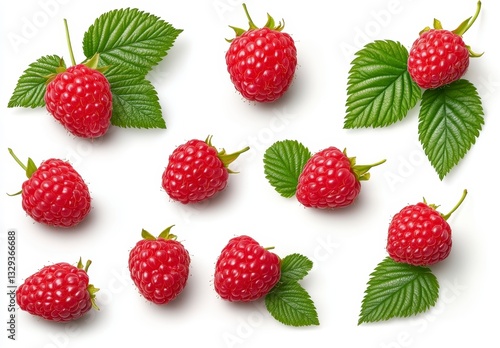 Red Raspberries and Green Leaves on White Background