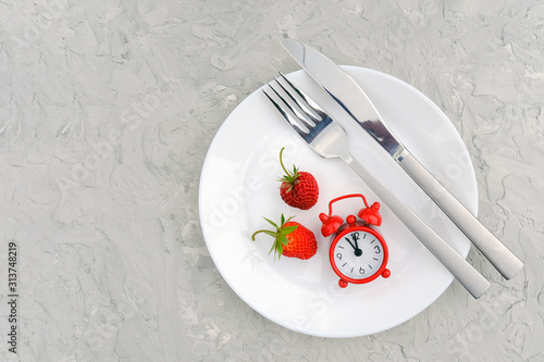 Red ripe strawberries berry on white plate, cutlery and red alarm clock on gray stone background table. Top view, flat lay, copy space Template. Concept diet and detox time or summer menu time