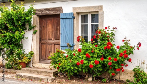 Red roses bushes near old rural house. Brittany, France. Vacation at countryside back