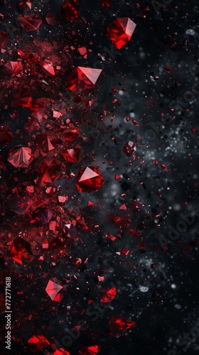 Red rubies on black backdrop. Symbols of luxury, wealth, prosperity. Abstract splashes of gemstones.