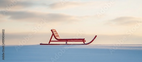 Red sled on snowy landscape at sunset.