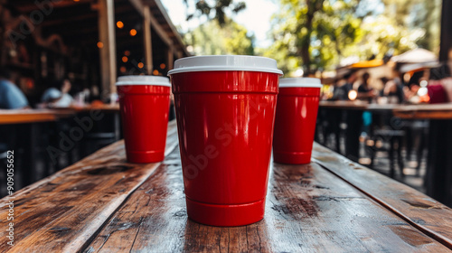 Red Solo cups scattered on a table with a blurry background of partygoers, symbolizing celebration, camaraderie, and the spontaneous joy of social gatherings