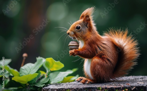 Red Squirrel Eating a Nut on a Tree Branch in a Forest