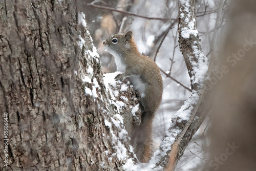 Red Squirrel Repose (Sciurus vulgaris) pauses on a stalwart tree in the dense forest. Free snow fall muffles its goings on in the wood