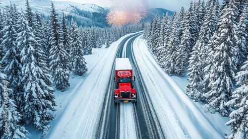 Red truck driving through a snowy landscape with fireworks.