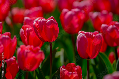 Red Tulip flower in tulip field at spring day. Colorful vivid pink tulips in the park. Spring landscape. Red tulip garden in spring. The Tulip. Beautiful bouquet of tulips in spring nature. Close up