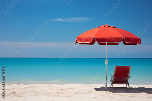 Red umbrella next to a comfortable chair on a turquoise beach, inviting viewers to indulge in the tranquil ambiance of a beachside getaway. Ai generated