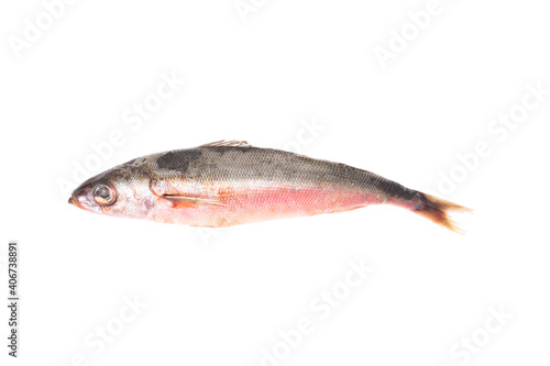 Red-eyed sea fish on white background, isolate. Fresh tasty fish for cooking, studio shot