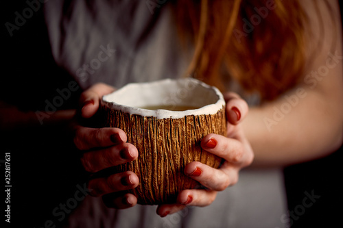 Red-haired girl holding a steaming drink. Coffee, tea or cocoa. Handmade ceramics