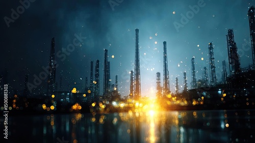 Refinery silhouette drive petroleum supply and global forecast concept. Industrial landscape with glowing lights in a dark environment.