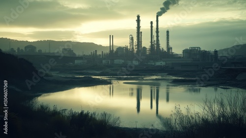 Reflective Industrial Sunset: A Serene yet Somber View of a Refinery at Dusk