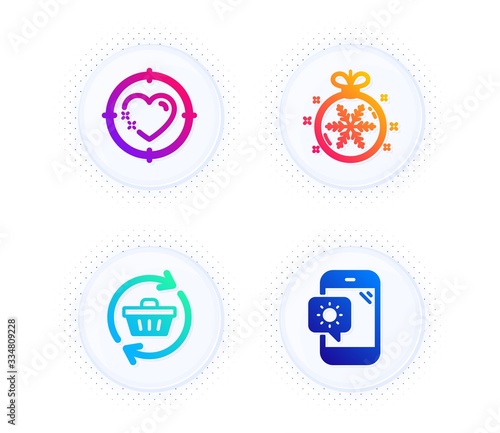 Refresh cart, Heart target and Christmas ball icons simple set. Button with halftone dots. Weather phone sign. Online shopping, Love aim, Snowflake. Travel device. Holidays set. Vector