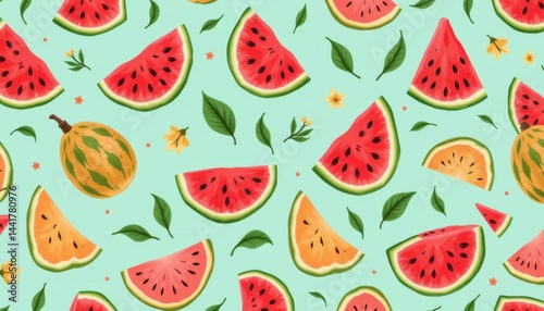 Refreshing and summery pattern with watermelon, cantaloupe, and honeydew.