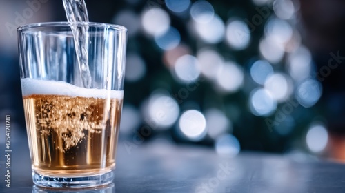 Refreshing beverage being poured into a glass with holiday lights in background