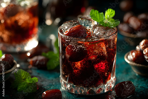 Refreshing beverage garnished with mint leaves and served with dates in a vibrant setting