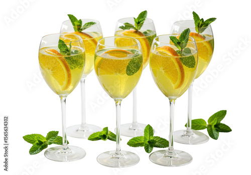 Refreshing beverages in elegant wine glasses with orange slices and mint sprigs displayed together on transparent background