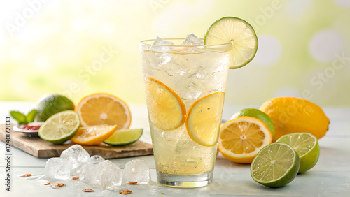 Refreshing Citrus Drink with Lemon and Lime Slices on Table