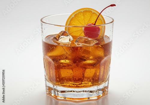 Refreshing cocktail drink with orange slice and cherry garnished on ice in elegant glass beverage