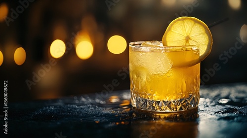 Refreshing Cocktail with Lemon Slice on a Wet Bar Surface during the Evening
