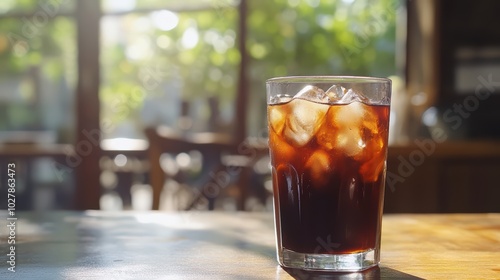 Refreshing glass of cold coffee with ice, perfect for a warm day in a cozy cafe setting, showcasing a summer vibe.