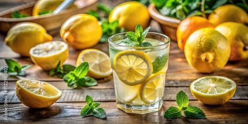 Refreshing glass of homemade lemonade with fresh lemons and mint on a rustic wooden table