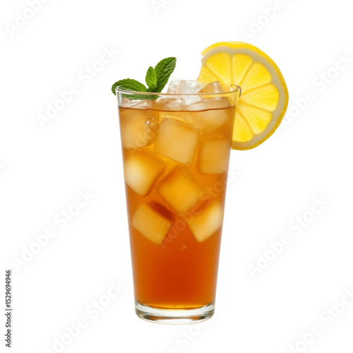 Refreshing Iced Tea: A tall glass of iced tea, garnished with a lemon wedge and fresh mint, perfect for a hot summer day. The amber liquid is inviting and refreshing.