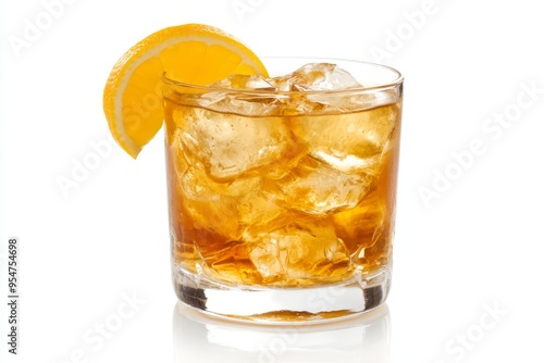 Refreshing Iced Tea in a Glass with Ice Cubes and an Orange Slice on White Background