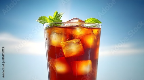 Refreshing Iced Tea in Glass with Mint Leaves and Ice Cubes
