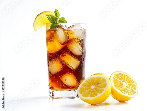 Refreshing Iced Tea with Lemon and Mint in a Transparent Glass on a White Background