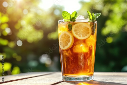 Refreshing Iced Tea with Lemon and Mint Leaves in Bright Sunlight