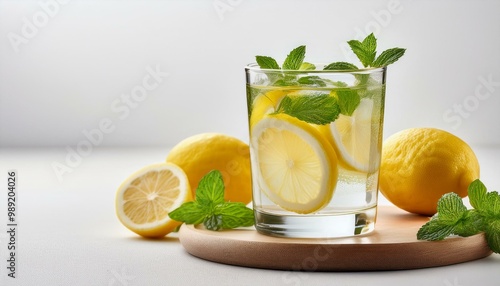 refreshing lemon mint water in glass on white background, healthy citrus drink concept