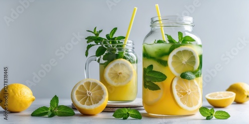 Refreshing Lemonade in Large Jars with Mint and Slices on a Light Table, Ideal for Summer Drinks and Beverage Promotions.