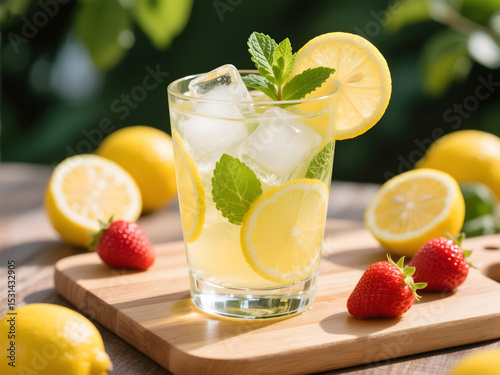 Refreshing Lemonade with Mint and Ice on Wooden Board