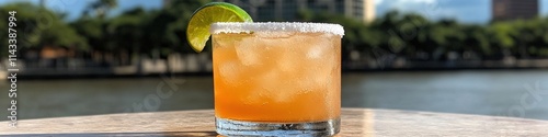 Refreshing Lime-Garnished Cocktail Against Urban Riverfront Backdrop: Perfect Blend of Summer Vibes, Cityscape, and Craft Mixology in Sunlit Setting